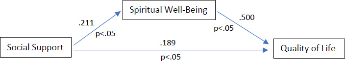 As demonstrated in Table 6, a significant association is observed between social support, spiritual well-being, and QoL, with coefficients of Beta = 0.189, p < 0.05, and Beta = 0.500, p < 0.05, respectively. Furthermore, the results of the product-moment analysis highlight a substantial correlation between social support and spiritual well-being (Beta = .211, p < .05). These findings imply that social support influences QoL, while concurrently impacting QoL through spiritual well-being, which functions as a mediator. Furthermore, spiritual well-being is also found to have a direct relationship with QoL.