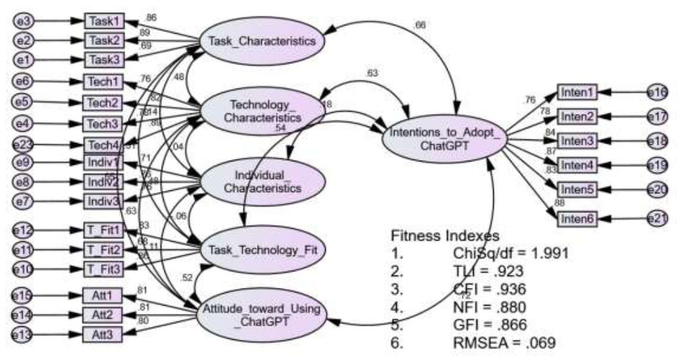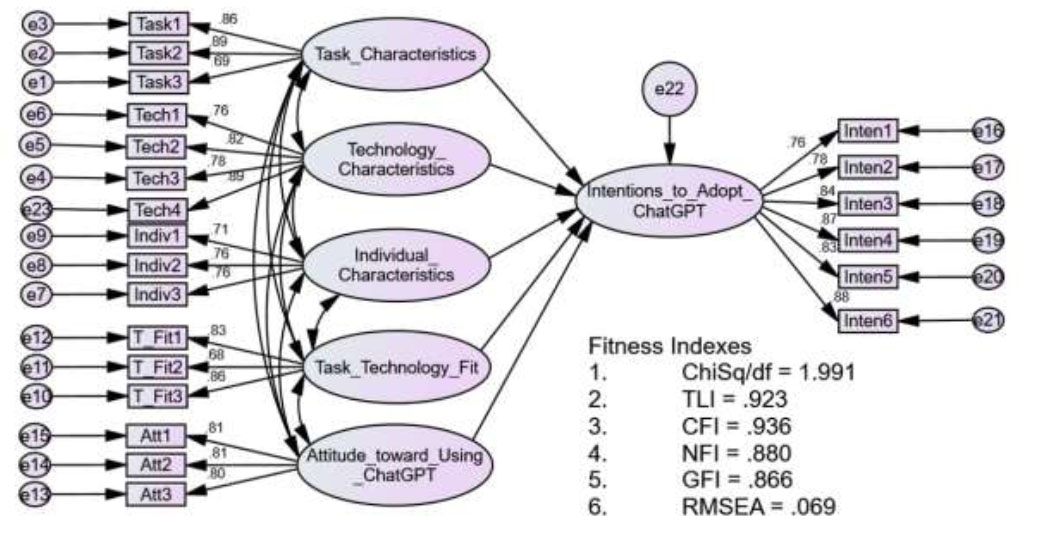 The findings revealed that task characteristics, technology characteristics, individual characteristics, task–technology fit, and students’ attitudes toward ChatGPT all had significant positive effects on their intention to adopt the tool. These results confirm the strength of the integrated theoretical framework, demonstrating that both the Technology-to-Performance Chain and the Technology Acceptance Model effectively explain students’ adoption behavior in the context of AI-assisted learning.
