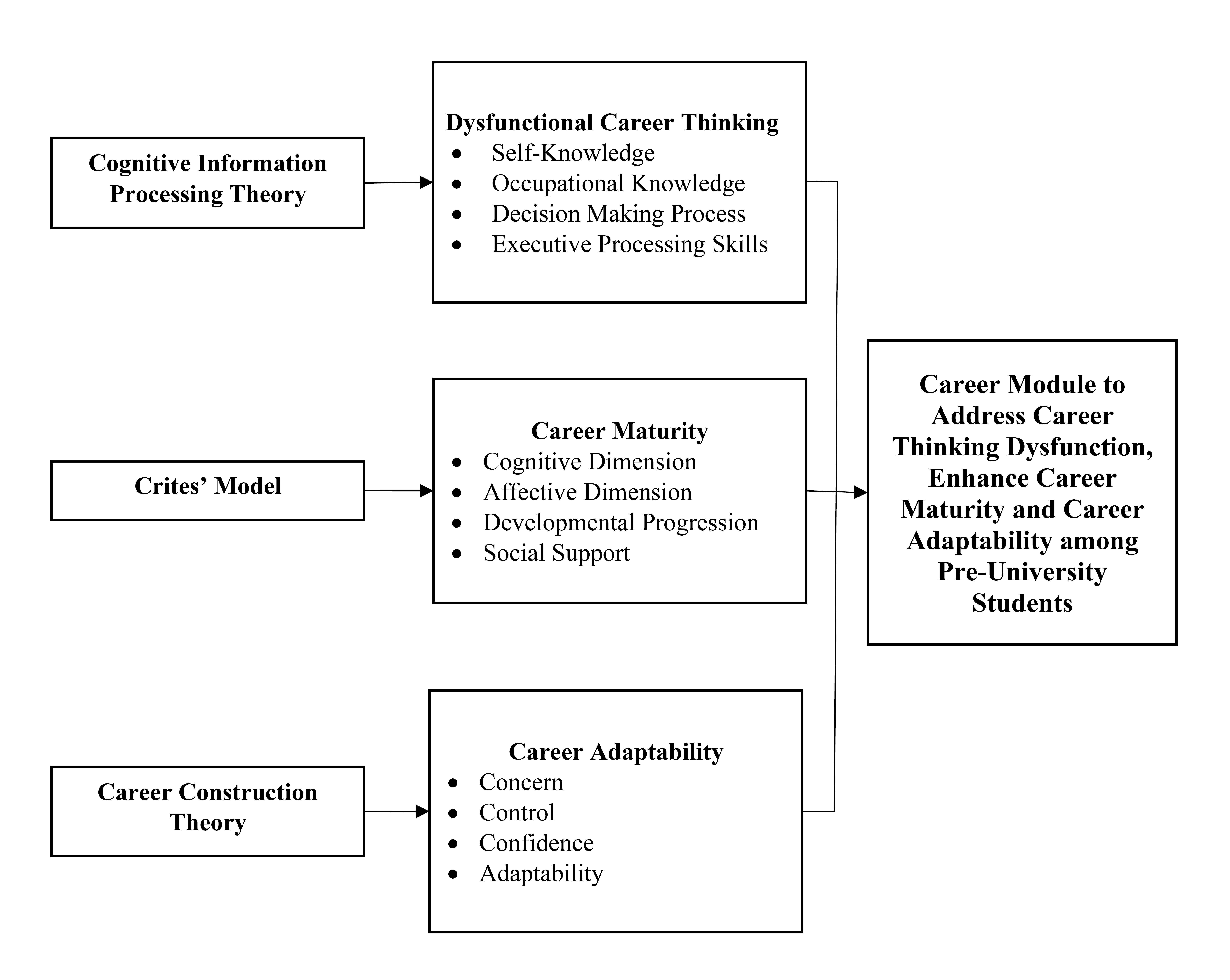 By integrating these three theoretical perspectives into a unified career module, the framework aims to provide a holistic intervention. This module not only addresses dysfunctional thinking but also builds maturity and adaptability, ultimately supporting pre-university students in developing a resilient and proactive approach to their career development.